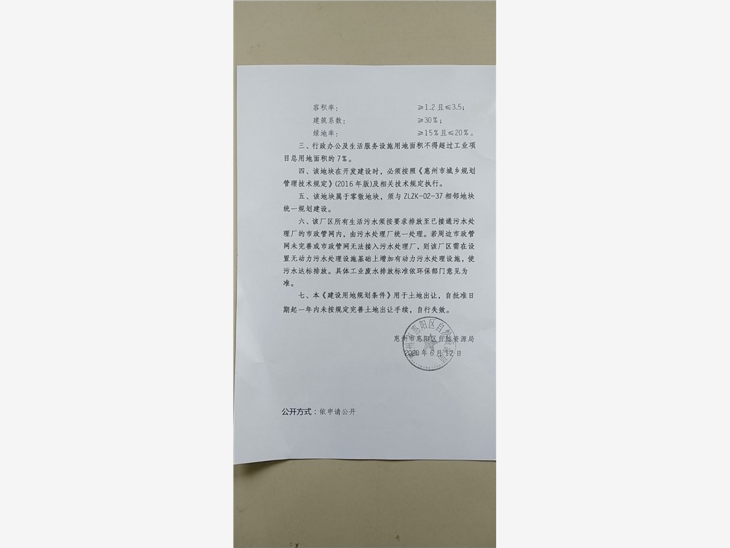 (三)该地块在开发建设时,必须按照《惠州市城乡规划管理技术规定》(2016年版)及相关技术规定执行。行政办公及生活服务设施用地面积不得超过工业项目总用地面积的7%。