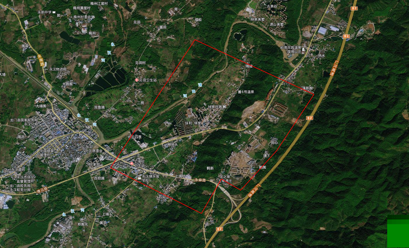 (三)矿区位置:永汉地热田位于龙门县县城235°方位,直线距离约32km处,行政区划属龙门县永汉镇管辖。水源地位置临近从化、增城,有省道G355通往县城,广河高速、汕湛高速从永汉镇通过,交通便利。矿区范围拐点坐标如下表(GCGS2000坐标系):